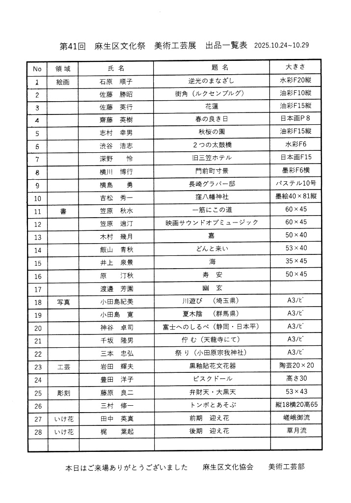 | 2025.10.24-10.29 | 第41回麻生区文化祭美術工芸展開催。 |              | |||
