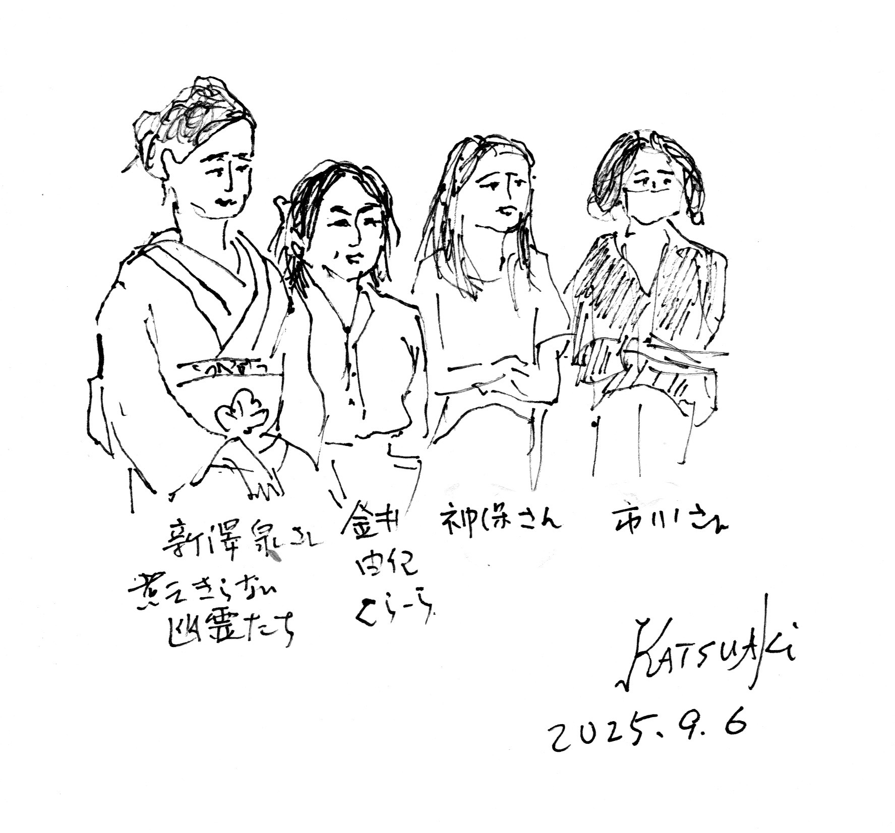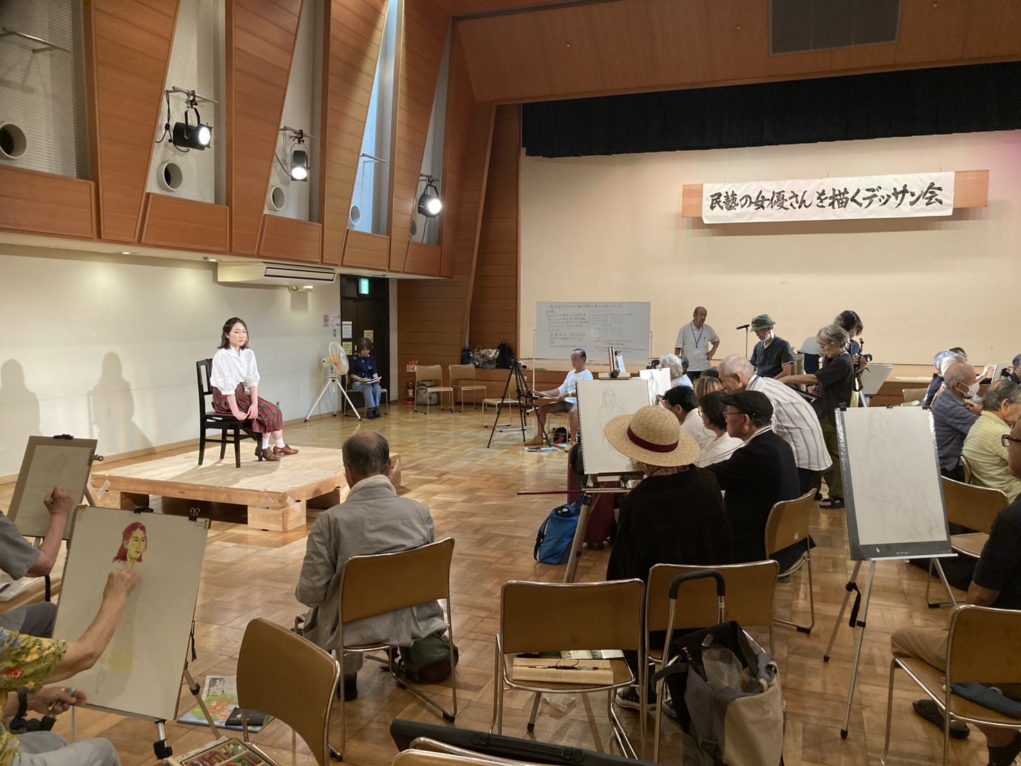 | 2025.09.06 | 「舞台衣装の女優さんを描こう」デッサン会を開催しました。 モデル:劇団「民藝」所属の女優さん2名(新澤泉さん、金井由妃さん) 会場:麻生市民館大会議室 13:00開場、16:00終了 終了後、女優さんと民藝の神保さん、市川さんを交えて懇談しました。  |
